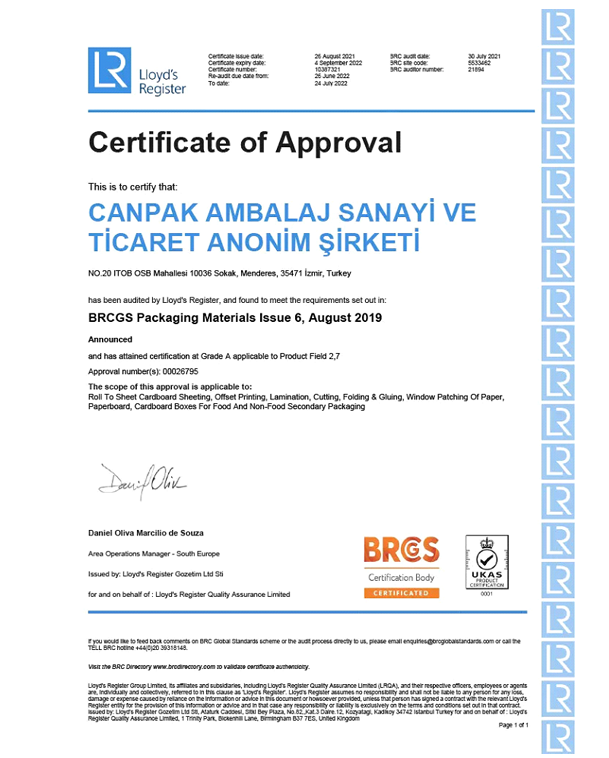 BRCGS, 130’dan fazla ülkede 29.000 sertifikalı tedarikçi tarafından kullanılan ve tüketicileri korumayı amaçlayan öncü bir kuruluştur. BRC belgesinin amacı uluslararası kabul görmüş gıda standartlarını kapsayıcı bir çerçeve oluşturmak ve gıda güvenliğinin gelişmesine yardımcı olmaktır. BRC tarafından belirlenen standartlar, kalite, güvenlik ve işletme kriterlerinin standardizasyonunu garanti altına alır ve nihai tüketici için koruma sağlar. Global pazarda güncel BRC sertifikasının önemini bilen tüm nitelikli gıda üreticileri AA –grade sertifikalı Kutu koli Atolyesini tercih etmektedir.